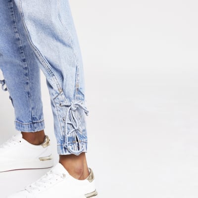 Dark Blue Bow Tied High Waist Casual Loose Cropped Tapered Jeans Beautifulhalo Com
