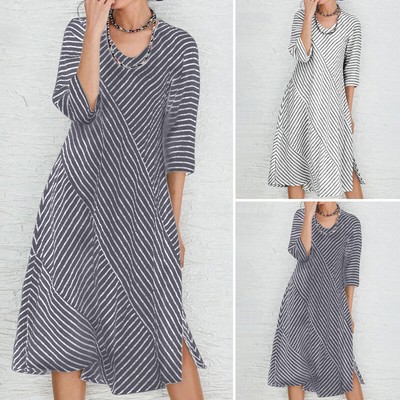 Cnfio Damen T Shirt Kleid Maxi Boho Streifen Kleid Fruhling 3 4 Lange Armel Kleider Mit Taschen Amazon De Bekleidung