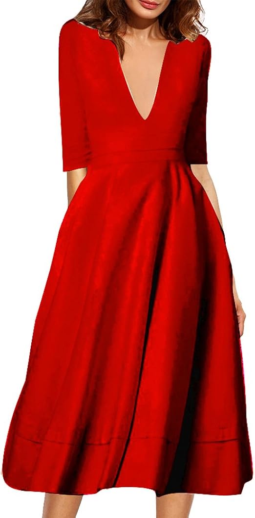Xiaoming Damen Ball Kleider Lang Elegant V Ausschnitt 3 4 Arm Abendkleider Rot 48 Amazon De Bekleidung