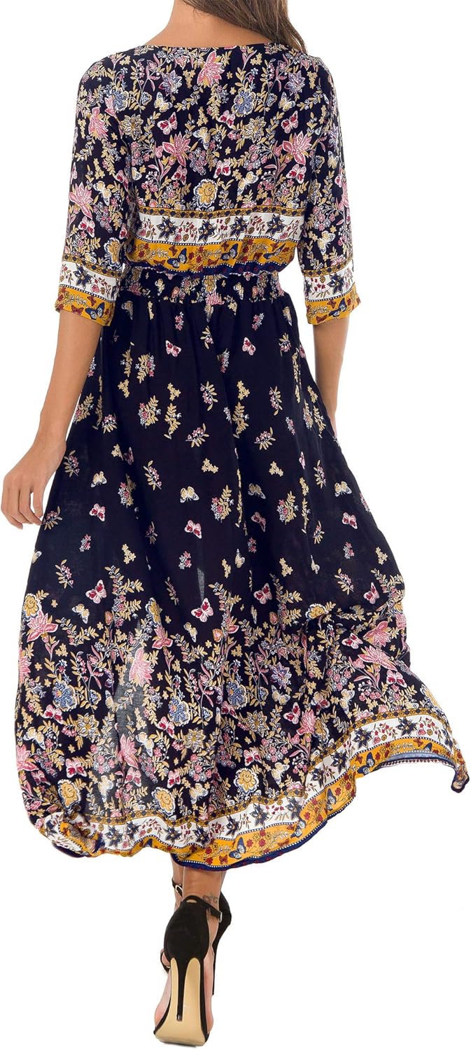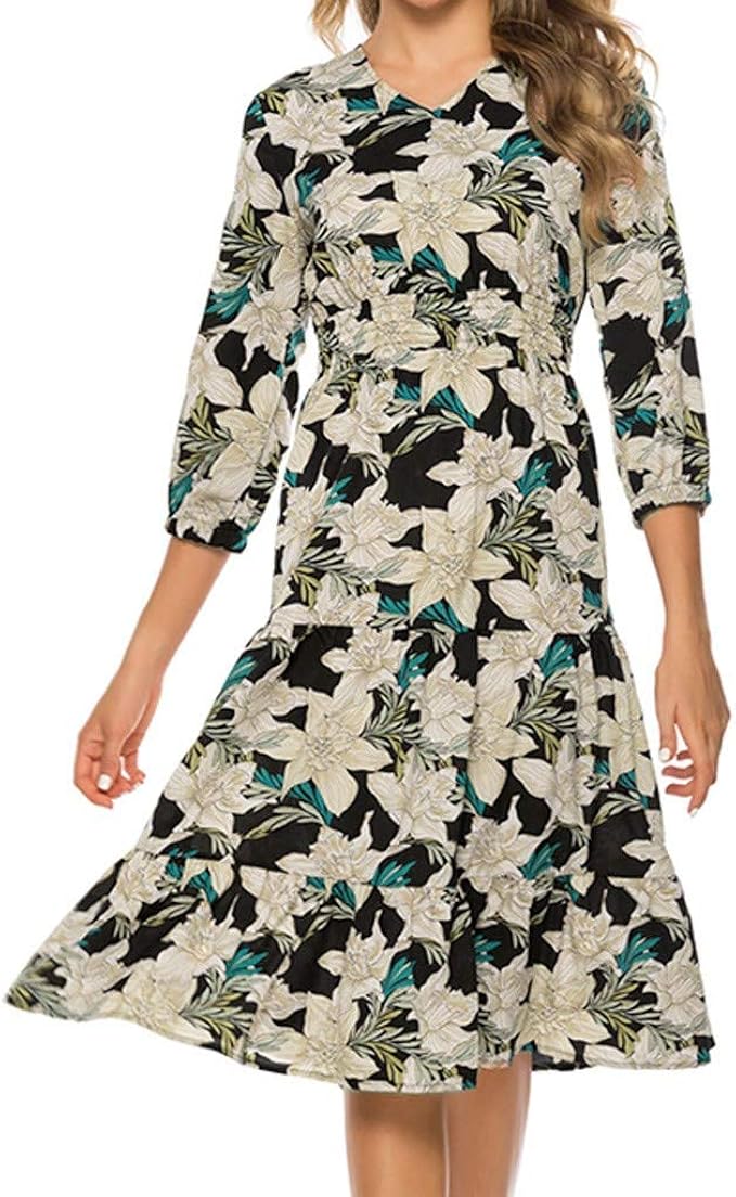 Izhh Lang Kleider Damen V Ausschnitt Floral Baggy Knielang Kleid 3 4 Armel Freizeit Sommer Stradnkleid Bohe Kleider Amazon De Bekleidung