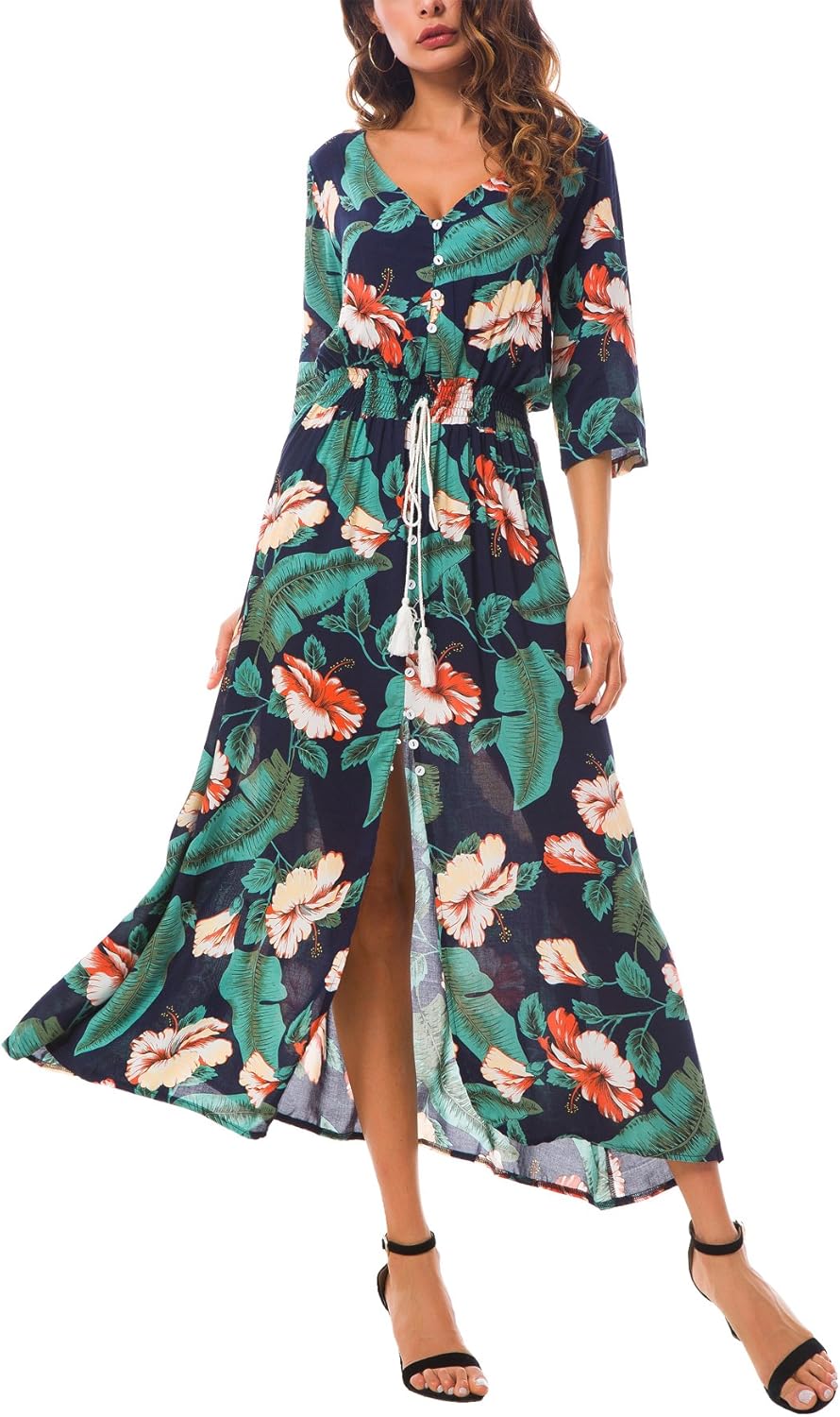 Damen Blumen Maxikleid Bohemien 3 4 Arm A Linie Elegant Lang Kleider Hemdkleid Partykleid Casual Amazon De Bekleidung