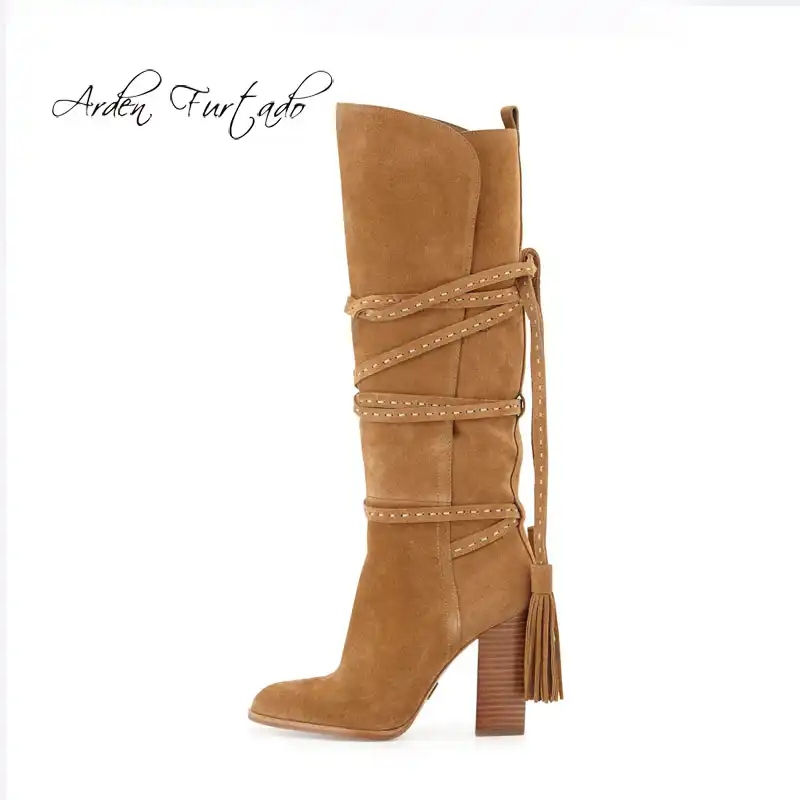 Arden Furtado 18 Fransen Frauen Schuhe Chunky Heels Lace Up Braun Mode Quasten Kniehohe Stiefel Mode Schuhe Neue High Heels Kniehohe Stiefel Aliexpress