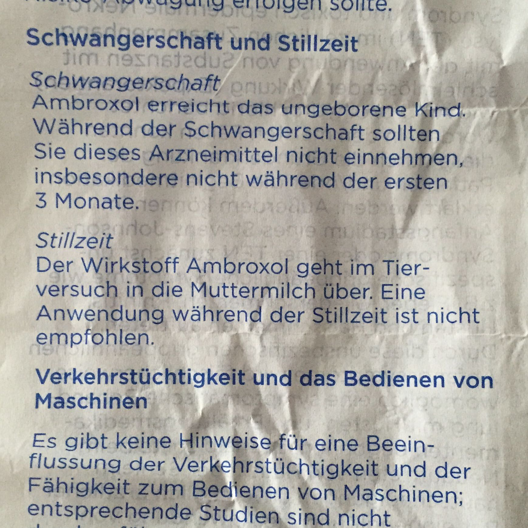 Wenn Sie überempfindlich (allergisch) gegen Ambroxol oder einen der sonstigen Bestandteile von dem Arzneimittel sind Schwangerschaft und Stillzeit Schwangerschaft und Stillzeit Bisher liegen keine ausreichenden Erfahrungen am Menschen vor. Was müssen Sie bei Schwangerschaft und Stillzeit beachten?. Eine Anwendung von Ambroxol während der Schwangerschaft und Stillzeit ist nicht möglich Vor allem während des ersten Drittels der Schwangerschaft muss auf die Einnahme von Ambroxol in jedem Fall verzichtet werden Der Wirkstoff kann die Plazenta passieren und somit in den Blutkreislauf des Babys gelangen Über die genauen Auswirkungen von.