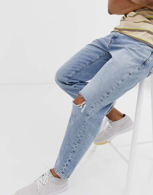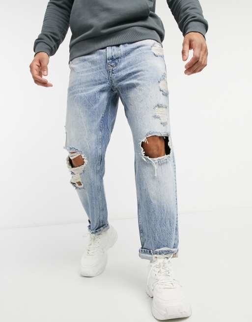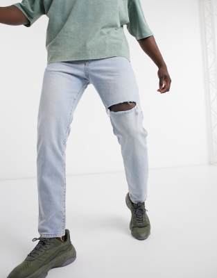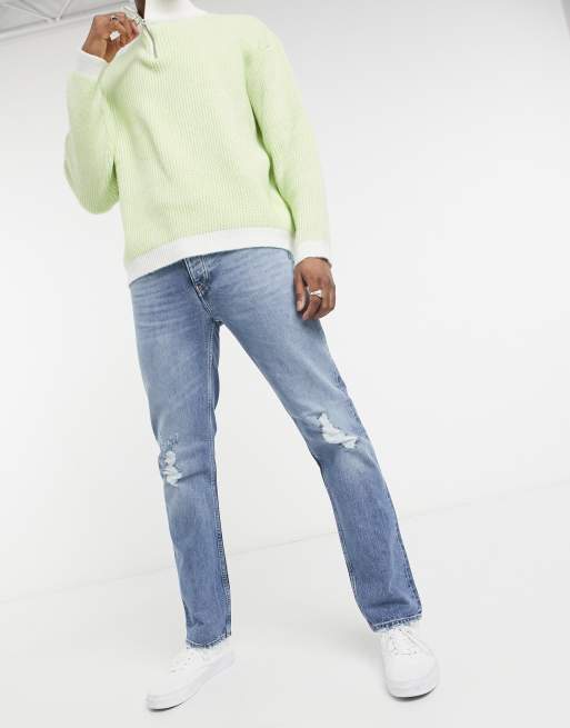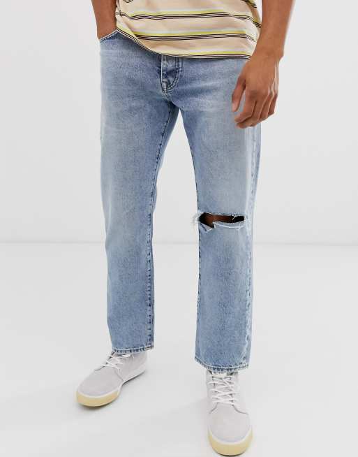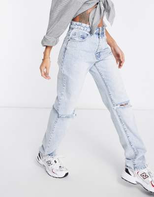 Pull Bear Gerade Geschnittene Jeans Mit Knierissen In Blau Asos