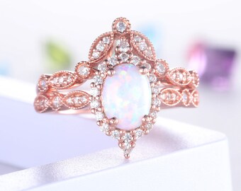Rose Gold Opal Engagement Ring Set Vintage Opal Wedding Ring Etsy