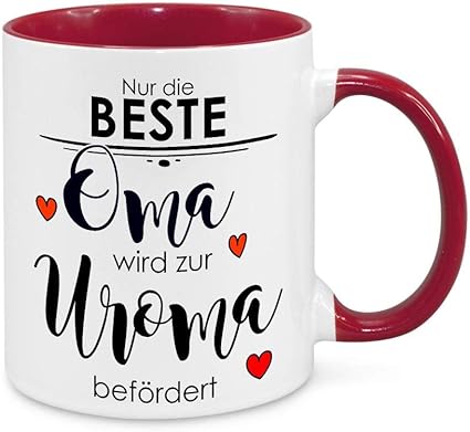 Mugaholic Nur Die Beste Oma Wird Zur Uroma Befordert Farbig Ausgefullt Bordeaux Tasse Mit Spruch Geburt Baby Nachwuchs Amazon De Kuche Haushalt