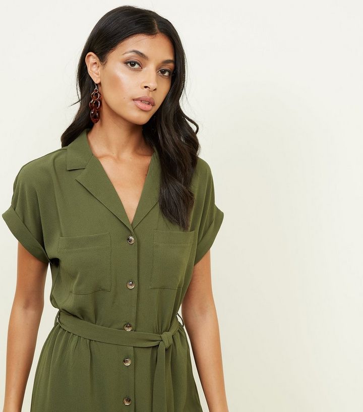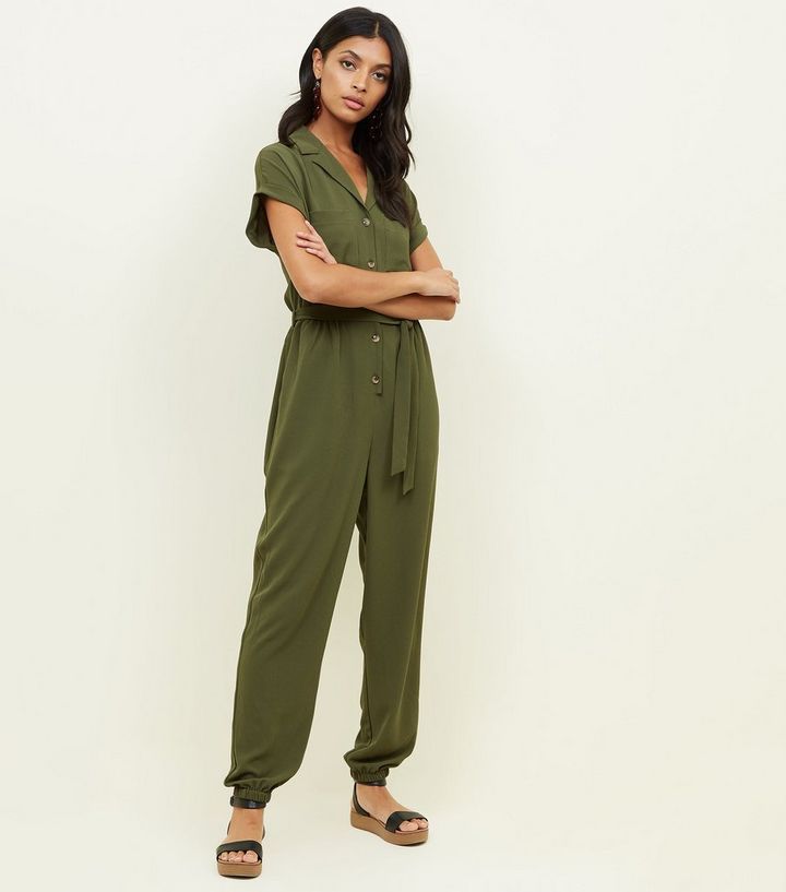 Khakifarbener Jumpsuit Mit Knopfleiste Vorne Und Revers Kragen New Look