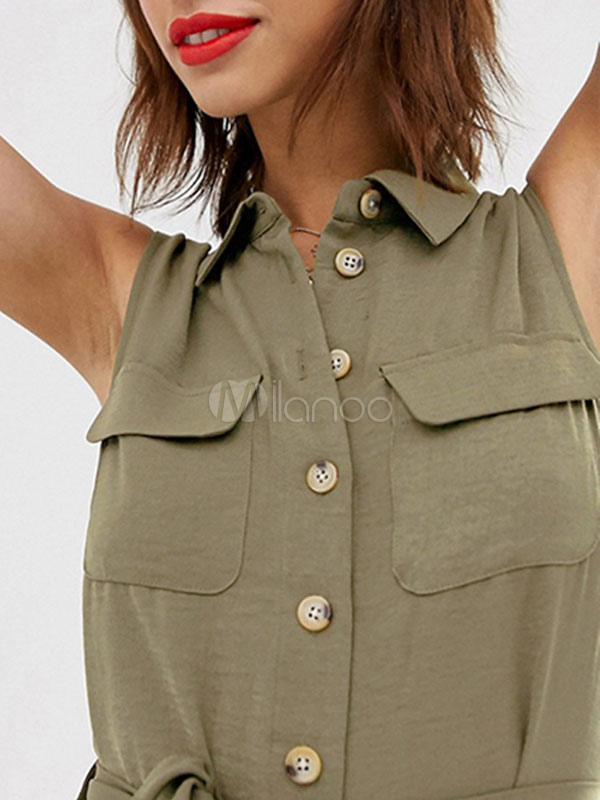 Wide Leg Jumpsuit Women Green Turndown Collar Sleeveless Pockets Overall Jumpsuit Milanoo Com