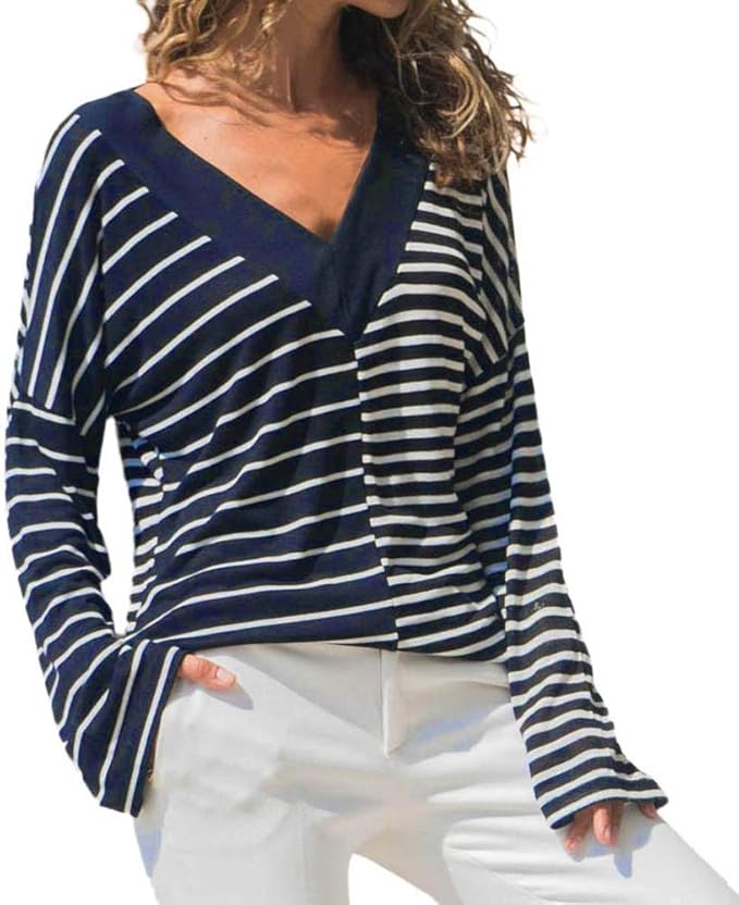 Schwarz Weisse Gestreifte Print V Ausschnitt Langarm Beilaufige Bluse T Shirt Tops Oberteile Damen Mode T Shirts Oberteile
