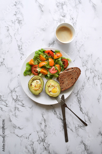 Healthy Eating Concept Baked Avocado With Quail Eggs Tomato Salat And Bread Cappucino Cup Breakfast Brunch Diet Food Low Carb Top View Marble Background Copy Space Flat Lay Buy This Stock
