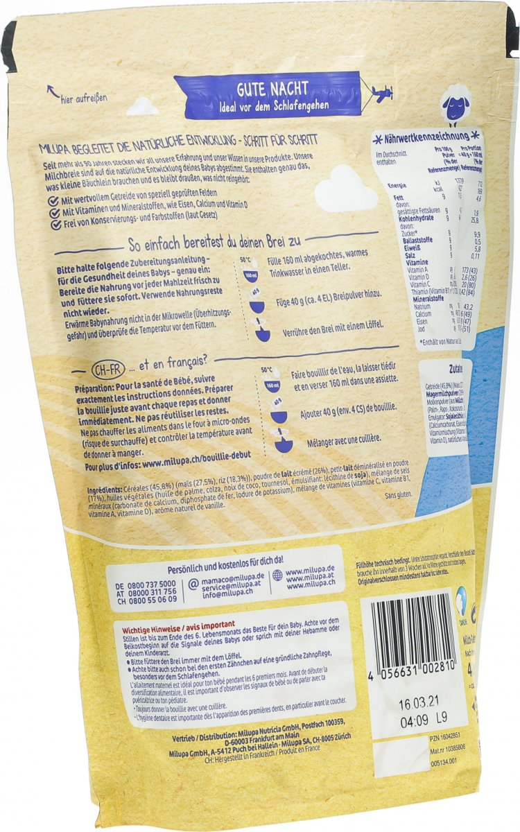 Jedes Baby ist anders und so kann die tägliche Breiportion auch sehr unterschiedlich sein Die angegebene Dosiertabelle soll Ihnen helfen, verschiedene Mengen Milchbrei richtig zuzubereiten nach dem 4 Monat 40 g (34 Esslöffel) 130 ml Wasser = 170 g;. Den Milchbrei am Abend empfehle ich nicht mit der Flasche zu füttern Warten Sie besser noch ab, bis sich Ihre Kleine an den Löffel gewöhnt hat und die Mittagsmahlzeit komplett eingeführt ist Bis dahin reicht eine PreNahrung am Abend aus. Milupa Gute Nacht Sanfter Start Milchbrei ab dem 4 Monat 400g CHF 785 Milupa Bio Getreide und Milchbreie sind Beikosten, welche an die speziellen Ernährungsbedürfnisse des Babys angepasst sind Innerhalb von 24 Stunden versandbereit;.