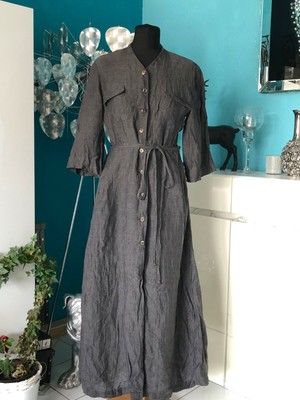Rene Lezard 100 Leinen Maxi Blusenkleid Halbarm Tailliert Mit Gurtel Anthrazit36 Ebay