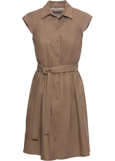 Geknopftes Leinen Kleid Mit Cuparmeln Und Bindegurtel Nougatbraun