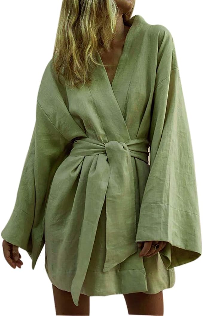 Shujin Damen Baumwolle Leinen Blusenkleid Elegant V Ausschnitt Einfarbig Kimono Design Kurz Langarm Sommerkleid Strand Minikleid Mit Gurtel Amazon De Bekleidung