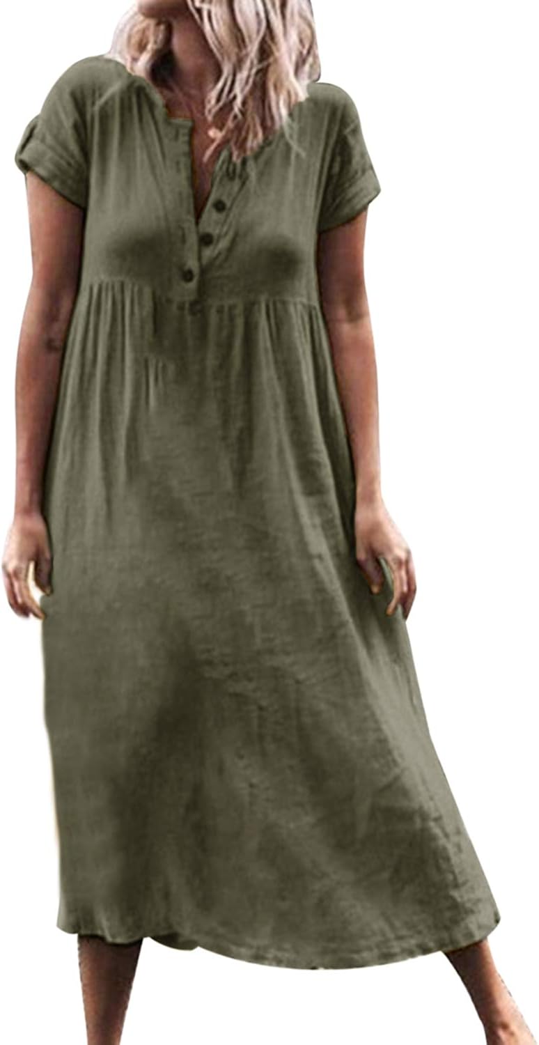 Style Dome Maxikleid Damen Casual Kurzarm Lang Leinen Sommerkleid Loose Solid Tunika Blusenkleid Kleider Sportbekleidung