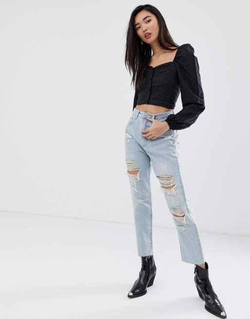 Stradivarius Schwarzes Oberteil Mit Eckigem Ausschnitt Knopfleiste Vorn Und Lochstickerei Asos