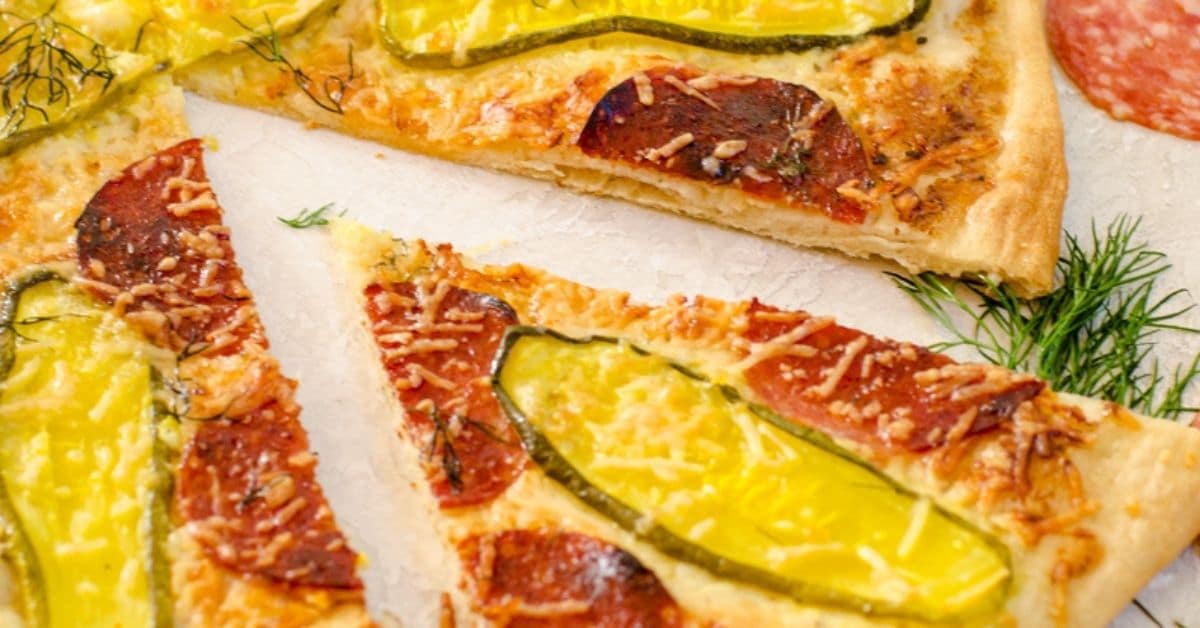 Dill Pickle Pizza With Crispy Salami Food Above Gold