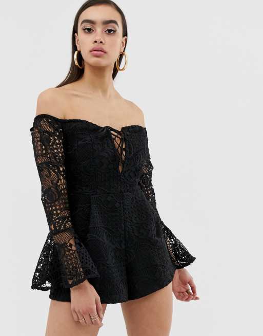 Lioness Schulterfreier Kurzer Jumpsuit Aus Schwarzer Spitze Mit Glockenarmeln Evesham Nj