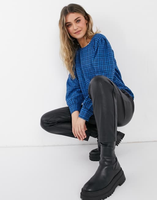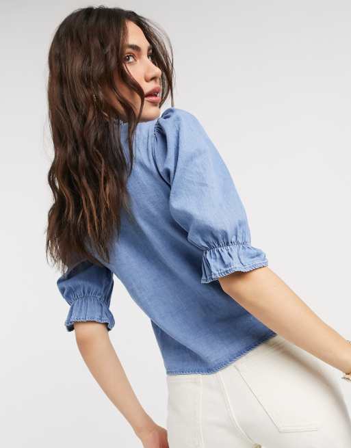 Monki Blaue Jeansbluse Mit Puffarmeln Und V Ausschnitt Asos
