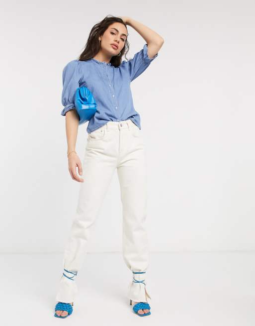 Vero Moda Hochgeschlossene Bluse Aus Denim Mit Puffarmeln In Blau Asos