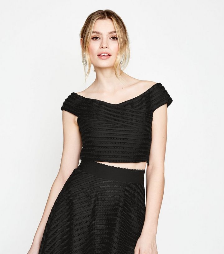 Schwarzes Crop Top Mit Bardot Ausschnitt Netzstoff Und Streifen New Look