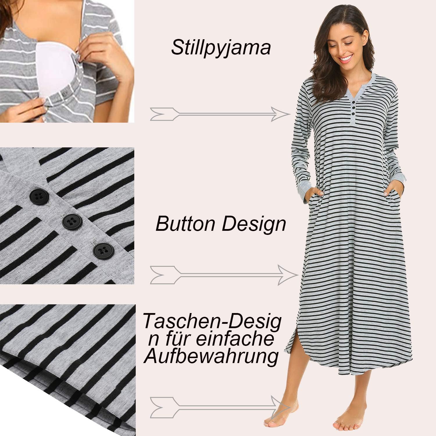 Nachthemd Schlafkleid Stillen Pyjama Damen Lang Streifen Knopfleiste V Ausschnitt Nachtwasche Schlafanzug Schwangere Jersey Mit Taschen Nachtwasche Bademantel Bekleidung