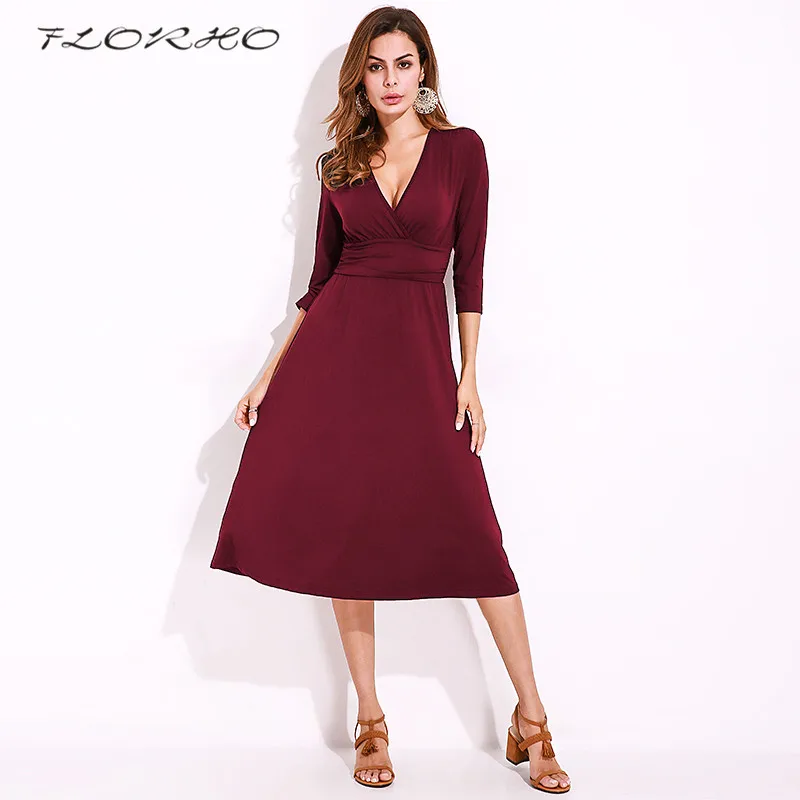 Damen Kleider Frauen Langarm V Ausschnitt Wrap Slim Einfarbig Casual Midi Kleid Mode Elegante Stil Weibliche Kleid Vestido Kleider Aliexpress