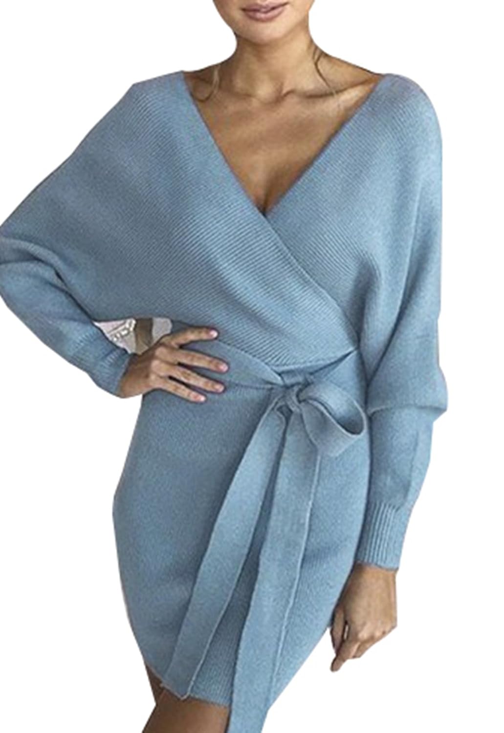 Ziyyoohy Damen Elegant Pulloverkleid Strickkleid Tunika Kleid V Ausschnitt Langarm Minikleid Mit Gurtel Kleider Bekleidung