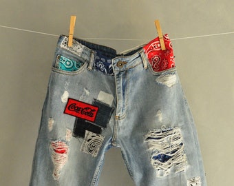 Hand Made Patched Denim Embowered Slime Jeans Reworked Patched Painted Vintage Jeans Boyfriend Jeans 90s 80s Clothing Vintage Jeans Denim Patches Embellished Jeans