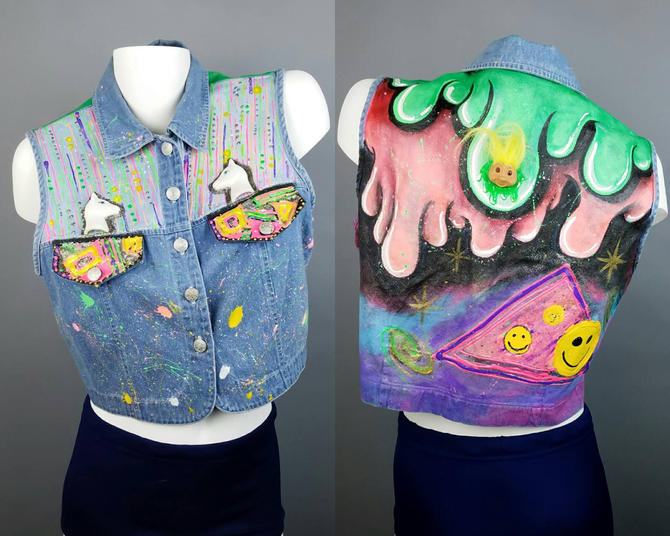 Custom Denim Vest Hand Painted Medium Large Cropped Sleeveless Jean Jacket Neon Slime Splatter Paint Festival Fashion Wearable Art By Slimewarpvintage From Slimewarp Vintage Of Frederick Md Attic