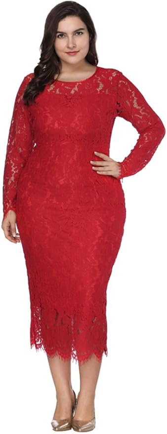 Battercake Kleider Damen Festlich Elegante Grosse Grossen Fruhling Herbst Longsleeve Etuikleid Spitzenkleid Casual Frauen Rundhals Bleistiftkleid Cocktailkleid Knielang Spleiss Mode Partykleid Rot Amazon De Bekleidung