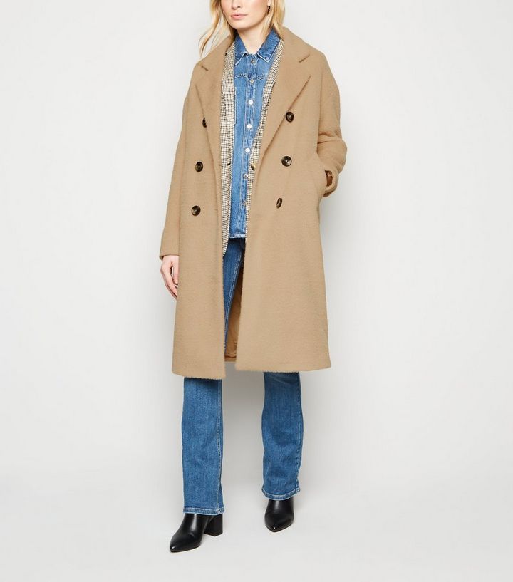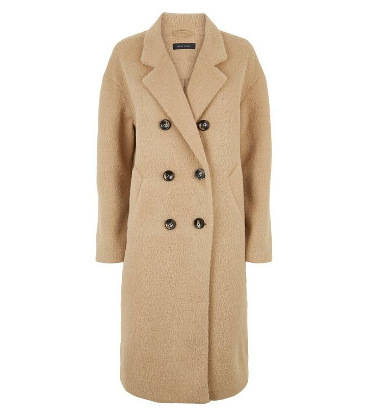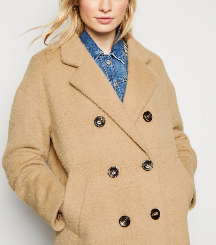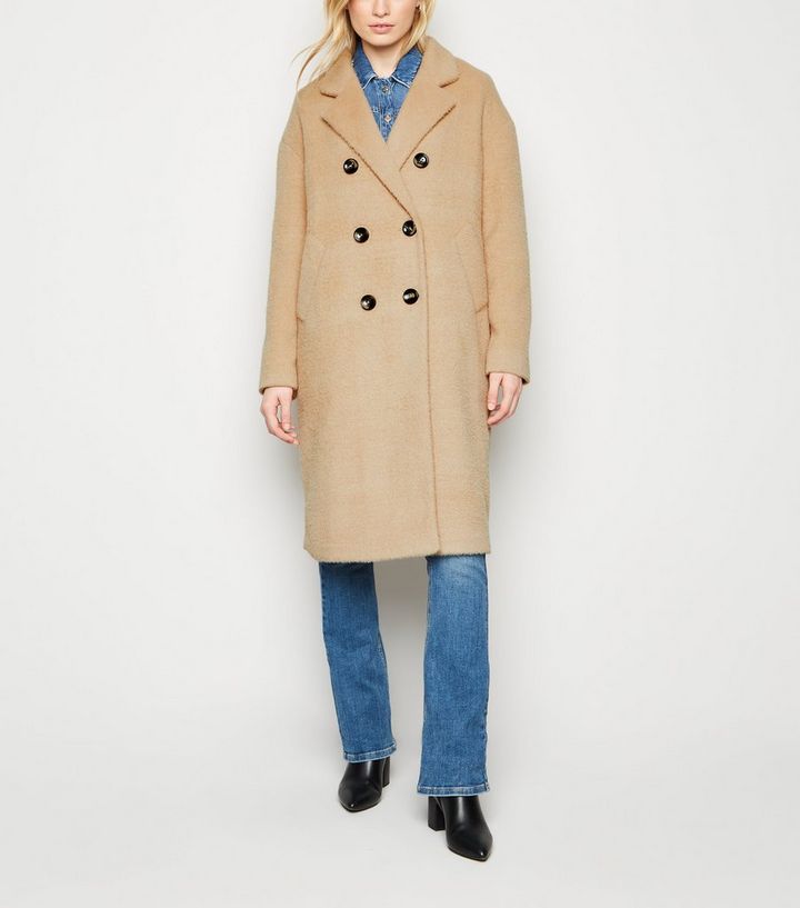 Flauschiger Zweireihiger Mantel In Beige New Look