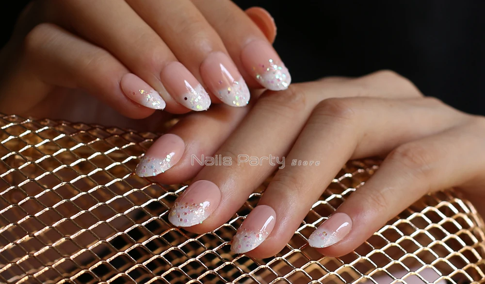 Pink Nude Oval Fake Nails French Glitter False Nails Ab Diamond Flash Cute Girl Medium Lovely False Nails Aliexpress