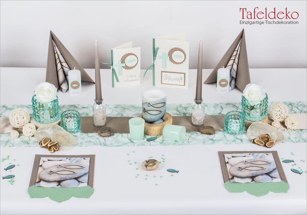12 Mustertisch Fische Steine In Taupe Mint Tischdeko Kommunion Konfirmation Tafeldeko De