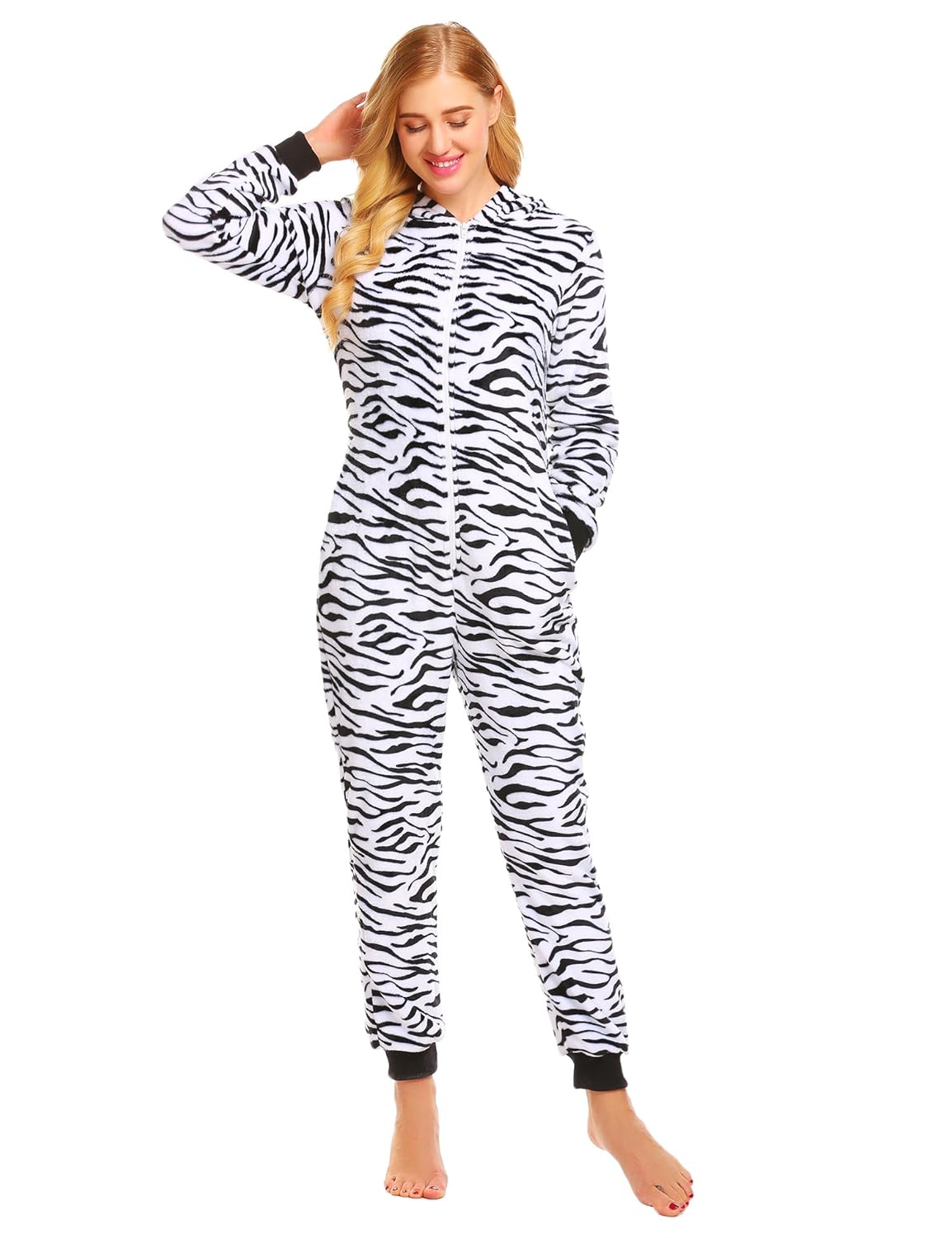 Schlafoveralls Berdith Pyjama Damen Einteiler Jumpsuit Onesie Schlafoveralls Mit Kapuze Kuscheliges Schlafanzug Langarm Strampler Mit Reissverschluss Fur Frauen Madchen Weiss 40 42 Bekleidung