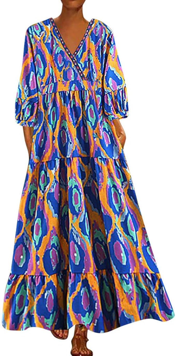 Boyyang Sommerkleider Damen Langes Kleider Grosse Grossen Frauen Boho Gedruckt Langarm V Ausschnitt Kleid Maxikleid Saum Baggy Kaftan Langes Kleid Maxikleid Strandkleider Tunika Kleid Etuikleid Amazon De Bekleidung