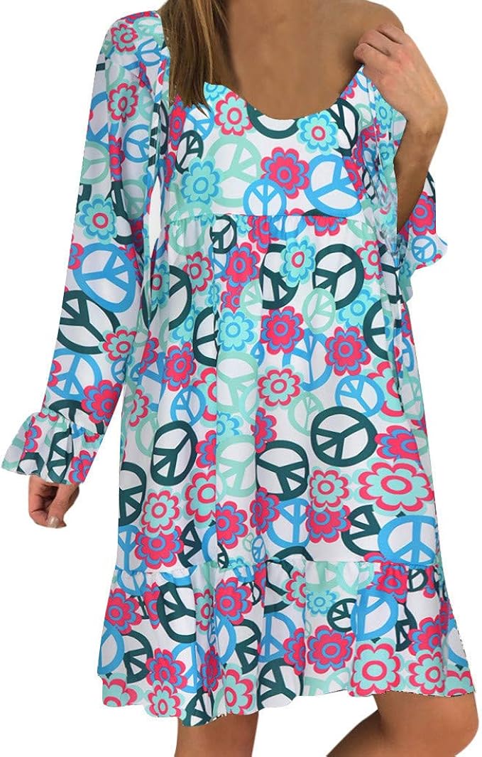 Oufour Sommerkleider Grosse Grosse Kleider Strandkleider Casual Locker Minikleid Damen Rundkragen Langarm Bohemian Druck Kleider Abendkleider Amazon De Bekleidung