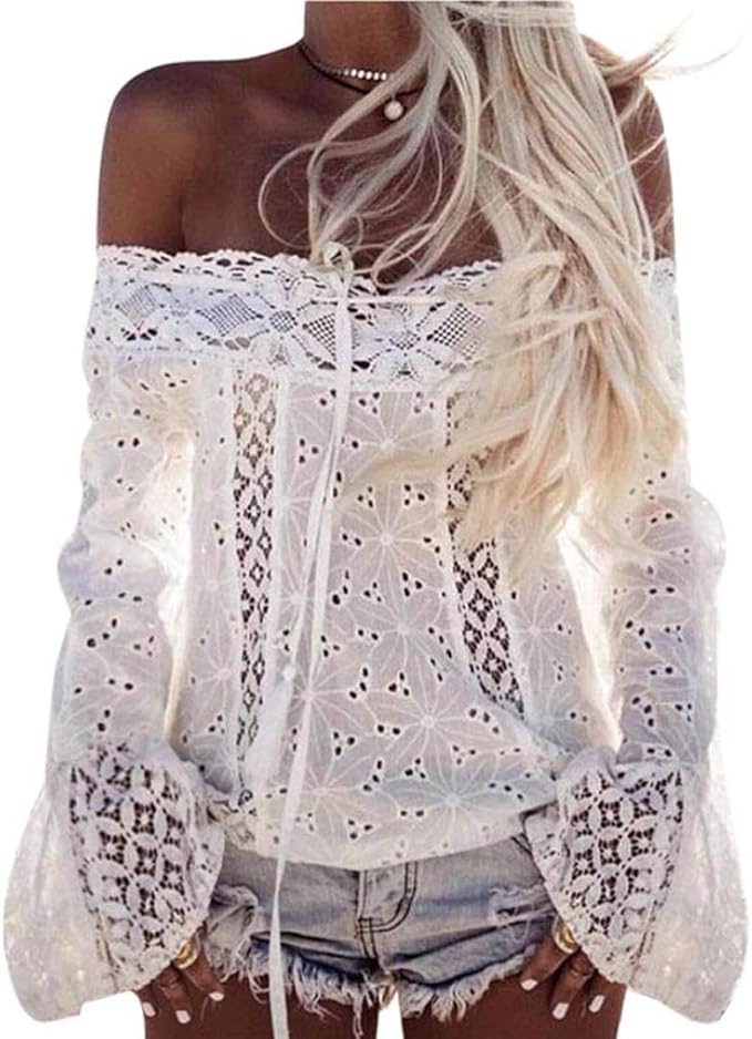 Amuster Dan Damen Off Shoulder Lange Armel Oberteil Weiss Spitze Lose Bluse Tops T Shirt M Amazon De Bekleidung
