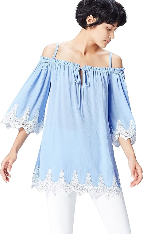 Find Bluse Damen Schulterfreies Carmen Oberteil Mit Spitze Wellenkante Schluppe Und Spaghettitragern Blau Blue 38 Herstellergrosse Medium Amazon De Bekleidung