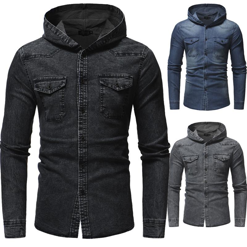 Schwarze Vintage Jeans Hemden Casual Herren Button Front Tops Mit Langen Armeln