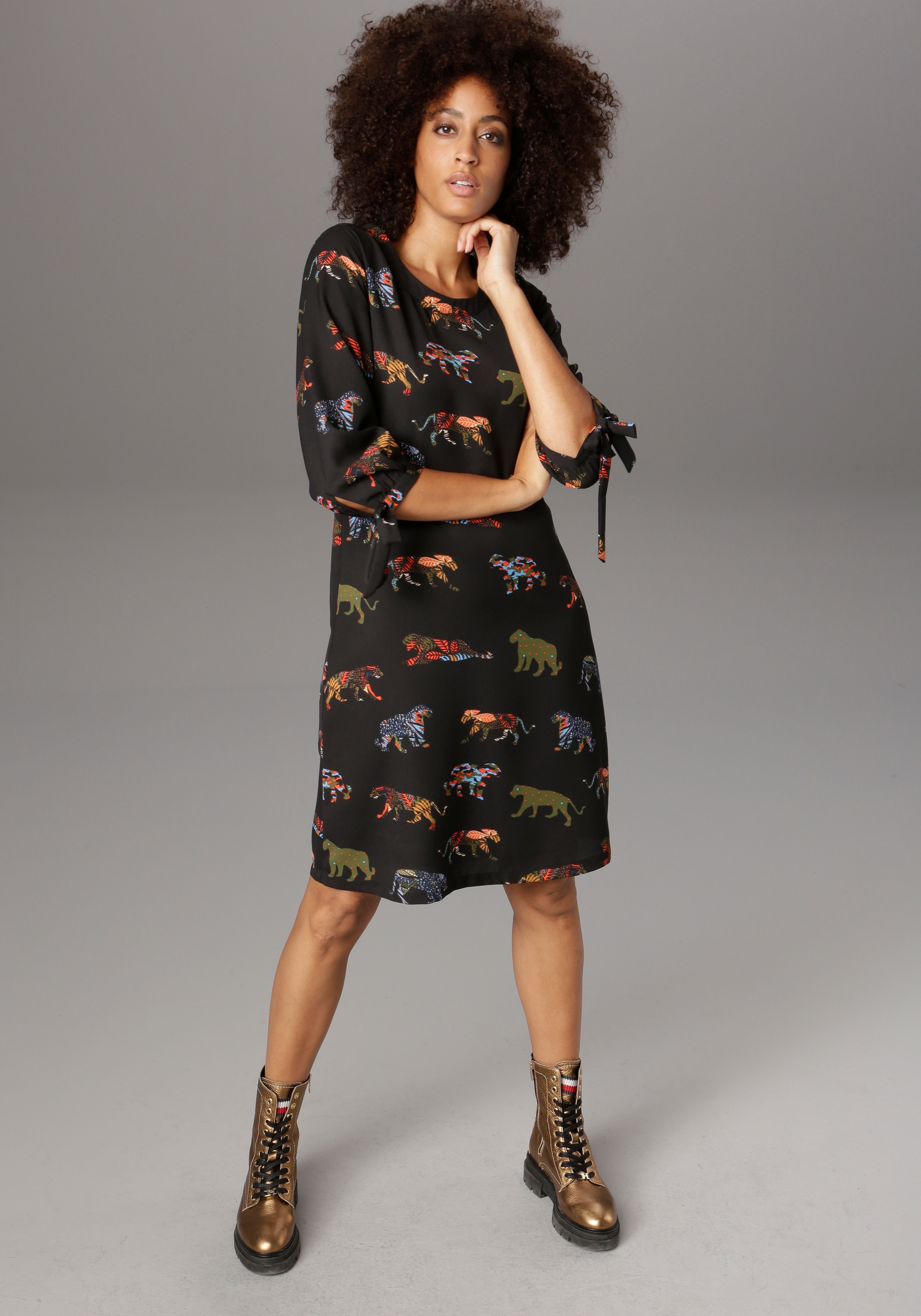 Zauberhaft Bedrucktes Blusenkleid Mit Stehkragen Grau Schwarz Leo Bedruckt