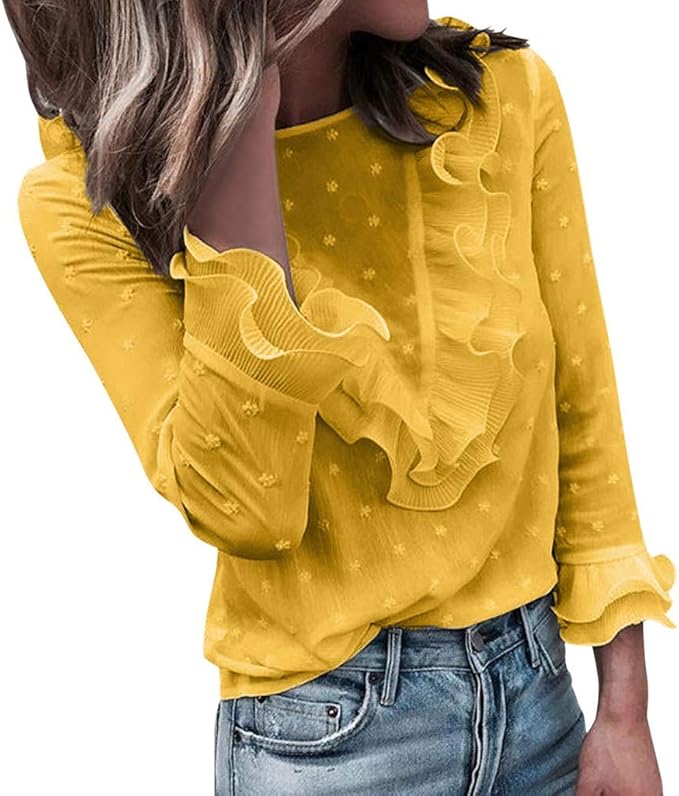 Damen T Shirt Langarm Bluse Spitze Top Lassig Elegant Ruschen Tees Mit Polka Dot Druck Blusentops Frauen Oberteile Tunika Langarmshirt Amazon De Bekleidung