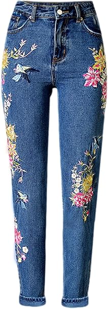 Yacun Damen Blumen Bestickt Hohe Taille Knochel Jeans Hose Amazon De Bekleidung