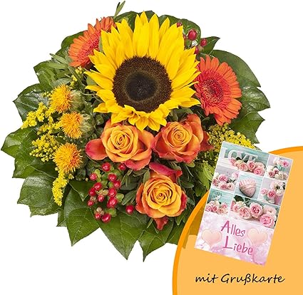 Dominik Blumen Und Pflanzen Blumenstrauss Sonnenlicht Mit Einer Sonnenblume Orangen Rosen Germini Farberdistel Und Goldrute Und Grusskarte Alles Liebe Amazon De Garten