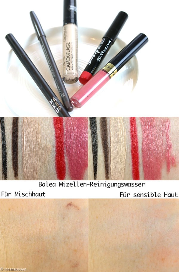 In den Abschminktest gehen die Hydra Active 3 MizellenTechnologie Reinigungsfluid von L'Oréal, das Mizellen Reinigungswasser von Garnier und die Mizellen Reinigungslotion von Avène Ich habe im Test immer Lipliner, Blush und (angetrocknete) Mascara auf meiner Hand verteilt, die Lösung auf ein Wattepad gegeben und mit leichtem Druck einmal über die Swatches gestrichen. Das Garnier Mizellen Reinigungswasser wurde mir in der Variante Normale & empfindliche Haut zur Verfügung gestellt;. Das Balea Gesichtswasser befreit unreine Haut von Pickeln und Mitessern Salizylsäure und Zink sorgen für eine porentiefe Gesichtsreinigung und beugen der Entstehung neuer Unreinheiten vor Das Hautbild wirkt verfeinert und ist ideal auf die folgende Gesichtspflege.