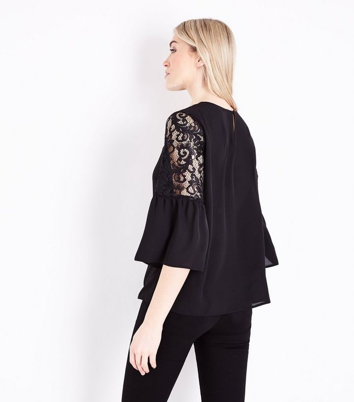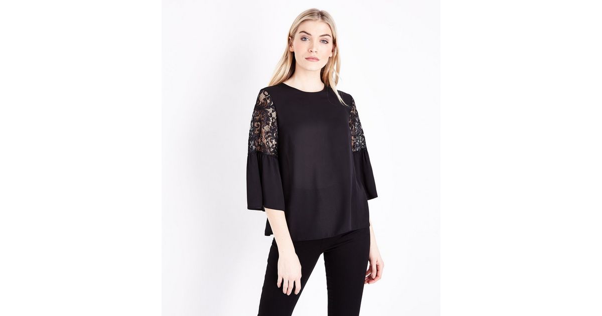Schwarzes Top Mit Spitze Und Flatterarmeln New Look