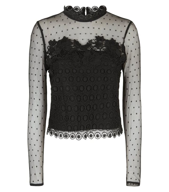Schwarzes Langarmliges Top Aus Spitze Und Netzstoff New Look
