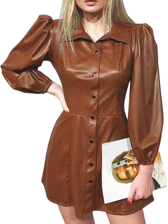 Loozykit Damen Elegante Langarm Kleid In Leder Optik A Linie Partykleid Clubwear Leder Look Abendkleid Wetlook Shirt Hemd Bluse Vintage Ledertop Clubwear Oberteil Loozykit Amazon De Bekleidung