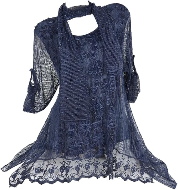 2tlg Kombination Lagenlook Spitze Tunika Bluse In Netz Optik 3d Blumen Twinset Schal 40 42 44 46 Blau M L Patchwork Pailetten Festlich 46 Amazon De Bekleidung