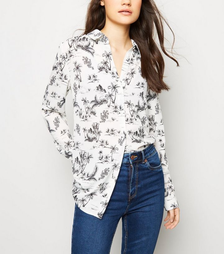 Weisses Lang Geschnittenes Hemd Aus Satin Mit Palmenmuster New Look